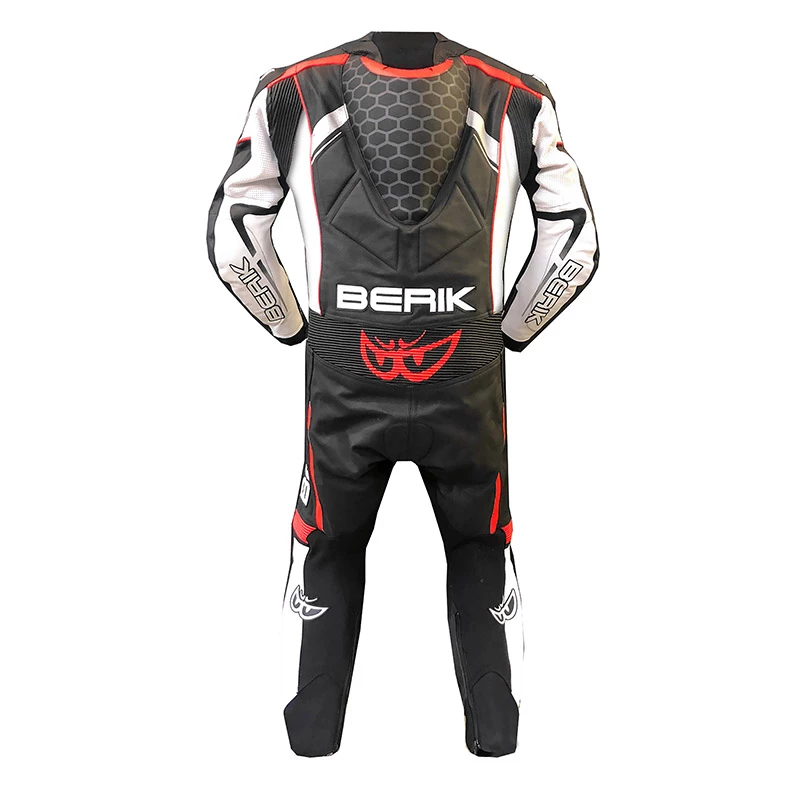 Racing leather suit Berik. 1.1-1.3mm premium full grain cow leather. Elastic fabric (tense tex), to provide flexibility & comfort on the inside sleeve, inside leg, back knee and chest area. Fixed mesh lining whit pannel of 3D mash in body area. Internal protectors CE approved : shoulder, elbow and knee. Aerodynamic hump in latex. Perforated leather inserts to improve ventilation Stretch leather panels at the knees, back, back armholes for comfortable & flexible movement. Double layer of leather to reinforce the elbow area shoulder area and seat area neoprene cuff to increase comfort in action, neoprene ankle area to help comfort with racing boot. PPE certification.