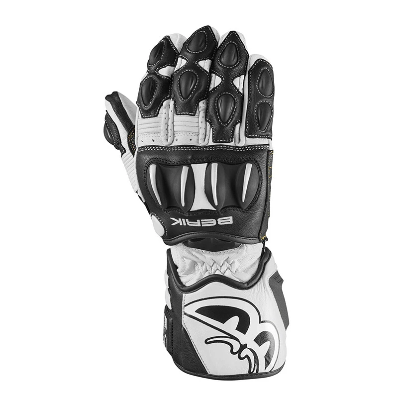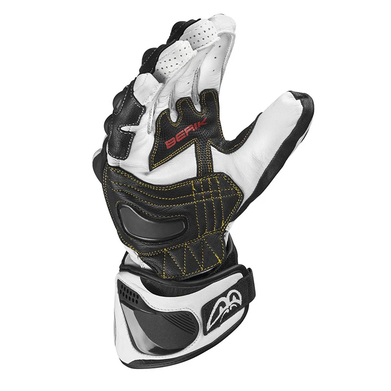 Motorcycle Racing Gloves In Berik 2.0. Data sheet: Motorcycle Racing Glove Pista Berik 2.0 In Cowhide. External protections In high-strength material on knuckles and fingers. Double Wrist Closure With Velcro suitable for under jacket. GRIP inserts on the palm. Stretch leather inserts. Anti abrasion reinforcements on the palm. Perforated leather inserts. Double stitching Super resistant. CE certified.